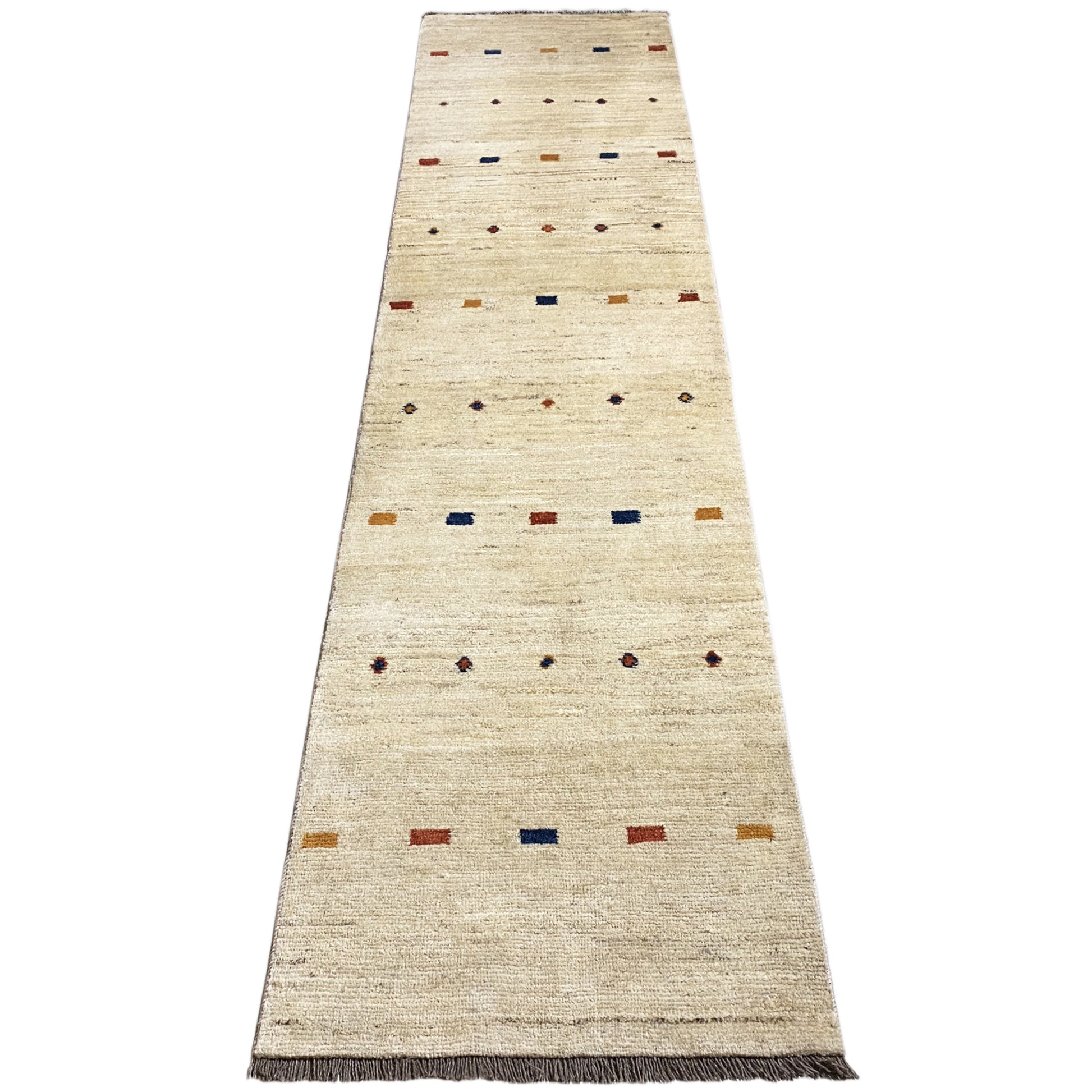 Dieser beeindruckende, handgeknüpfte Gabbeh Läufer in der großzügigen Größe 279x69cm ist aus handgesponnener, pflanzengefärbter Wolle gefertigt. Sein minimalistisches Design auf beigefarbenem Grund wird von dezenten, bunten Akzenten in Form kleiner Punkte und horizontaler Motive belebt. Ideal für lange Flure oder minimalistische Einrichtungsstile, bringt dieser Läufer eine ruhige Eleganz und natürliche Wärme in Ihr Zuhause, während er gleichzeitig durch seine schlichte Schönheit besticht.