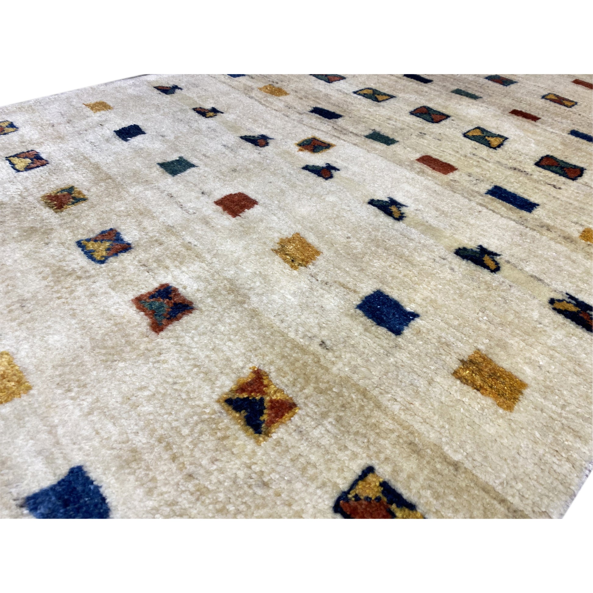 Dieser einzigartige, handgeknüpfte Gabbeh Teppich in der Größe 152x89cm ist aus handgesponnener, pflanzengefärbter Wolle gefertigt. Sein modernes Design zeichnet sich durch ein spielerisches Muster aus bunten Rechtecken und Quadraten auf hellem, beigefarbenem Grund aus. Er verleiht jedem Raum, ob im modernen, zeitgenössischen oder eklektischen Stil, eine lebendige Note und bringt gleichzeitig die natürliche Wärme und Textur eines authentischen Gabbeh Teppichs mit sich.