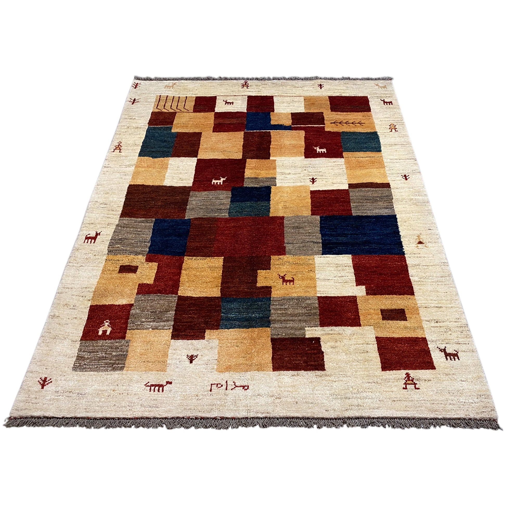 Dieser einzigartige, handgeknüpfte Gabbeh Teppich aus handgesponnener, pflanzengefärbter Wolle fasziniert mit einem dynamischen Patchwork-Muster in warmen Erd- und kräftigen Blautönen, umrahmt von einem hellen Rand mit charmanten, stilisierten Tier- und Menschenmotiven. Mit seinen großzügigen Maßen von 229x163 cm ist er ein ideales Statement-Stück, das jedem Raum, von traditionell bis eklektisch, eine künstlerische und zugleich erdverbundene Atmosphäre verleiht. Die Kombination aus traditioneller Handwerkskunst und dem spielerischen Design macht diesen Teppich zu einem besonderen Blickfang, der sowohl visuelles Interesse weckt als auch für Behaglichkeit sorgt.
