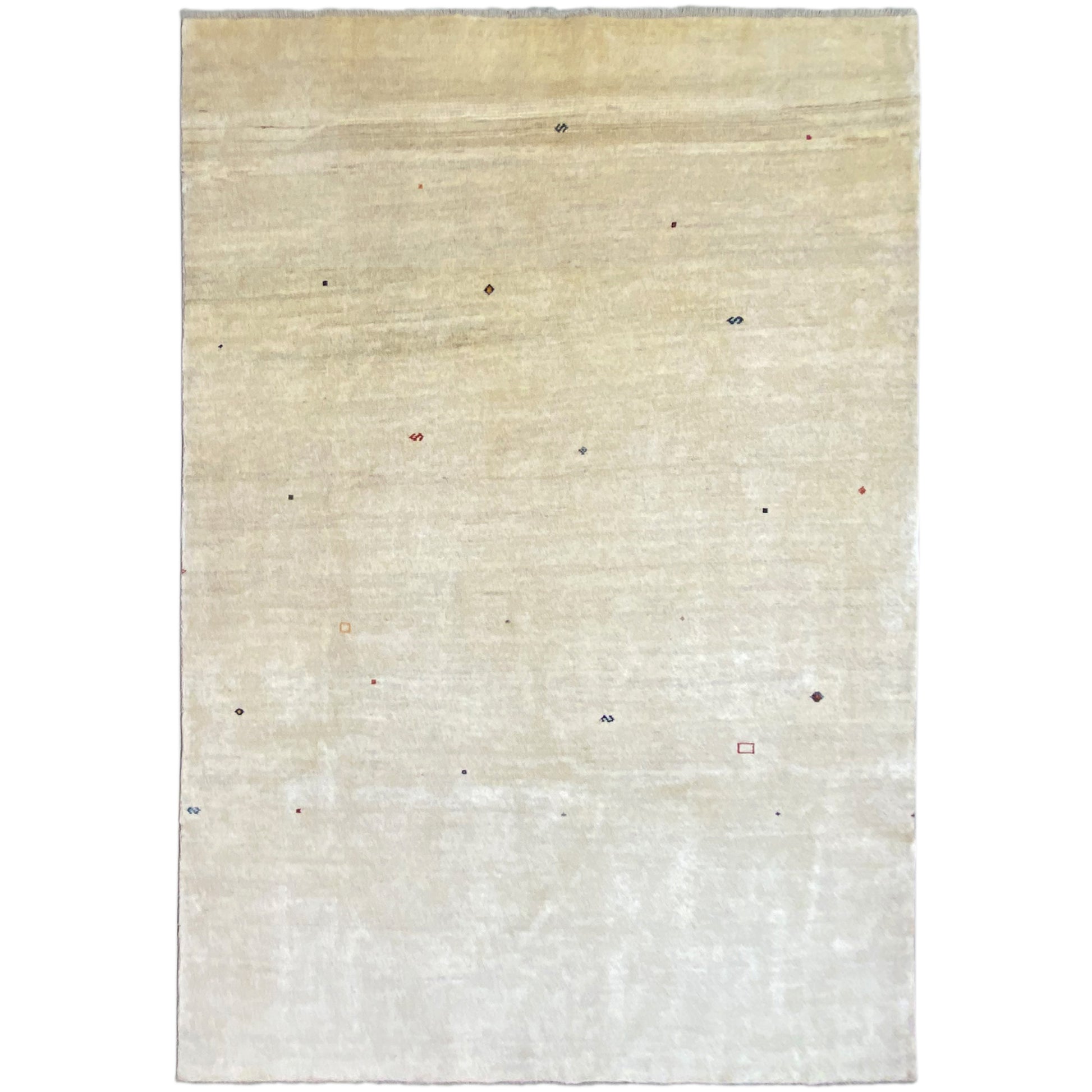 Dieser dezente, handgeknüpfte Gabbeh Teppich aus handgesponnener, pflanzengefärbter Wolle zeichnet sich durch seinen ruhigen beigefarbenen Grundton aus, der mit subtilen, zufällig gestreuten Farbpunkten versehen ist. Mit seinen großzügigen Maßen von 284x197 cm ist er eine hervorragende Wahl für Räume, die eine helle und offene Atmosphäre bewahren sollen, und fügt sich nahtlos in minimalistische, skandinavische oder moderne Einrichtungsstile ein. Das schlichte, aber dennoch interessante Muster verleiht dem Teppich eine unaufdringliche Eleganz, während die natürliche Wolle für eine angenehme Haptik und Langlebigkeit sorgt.