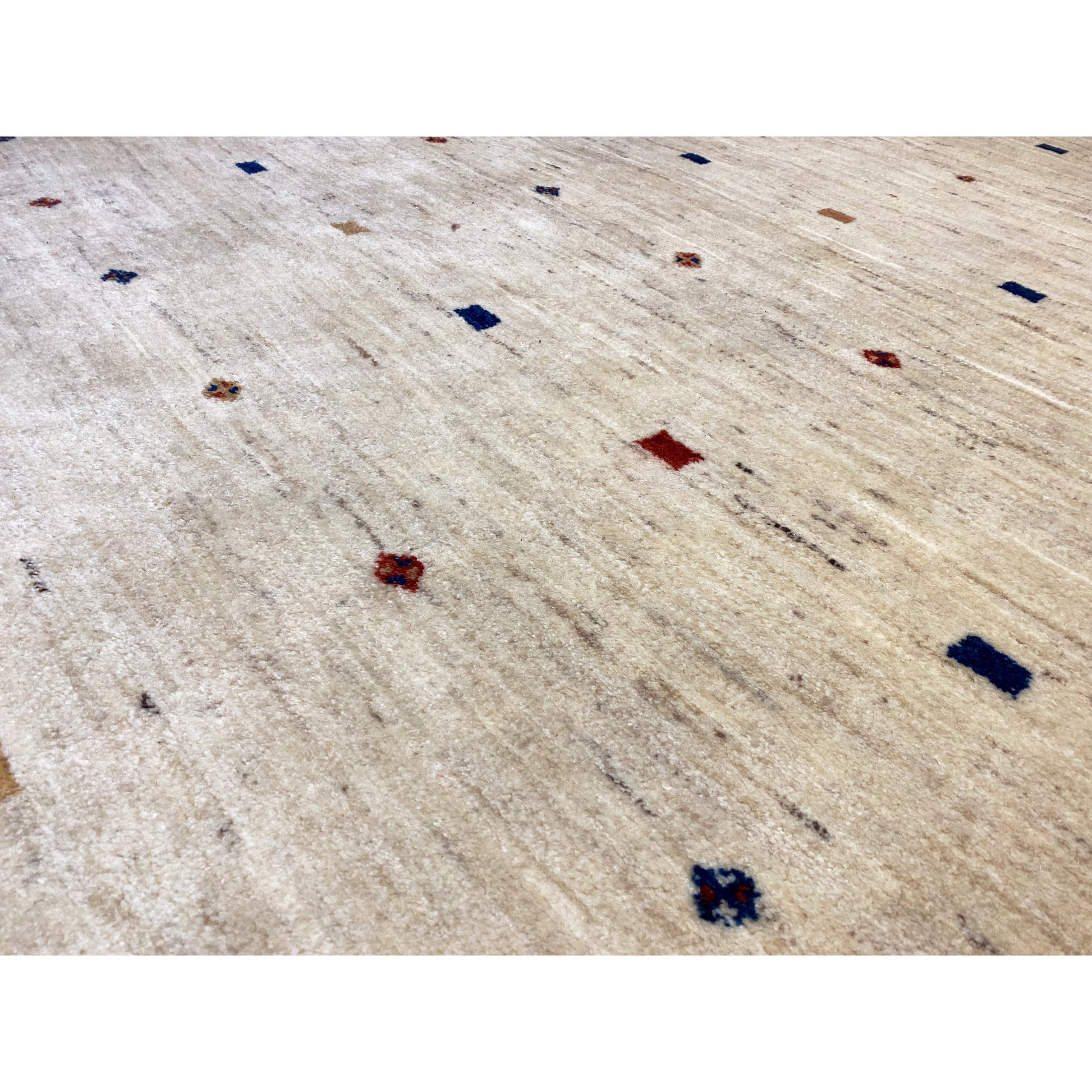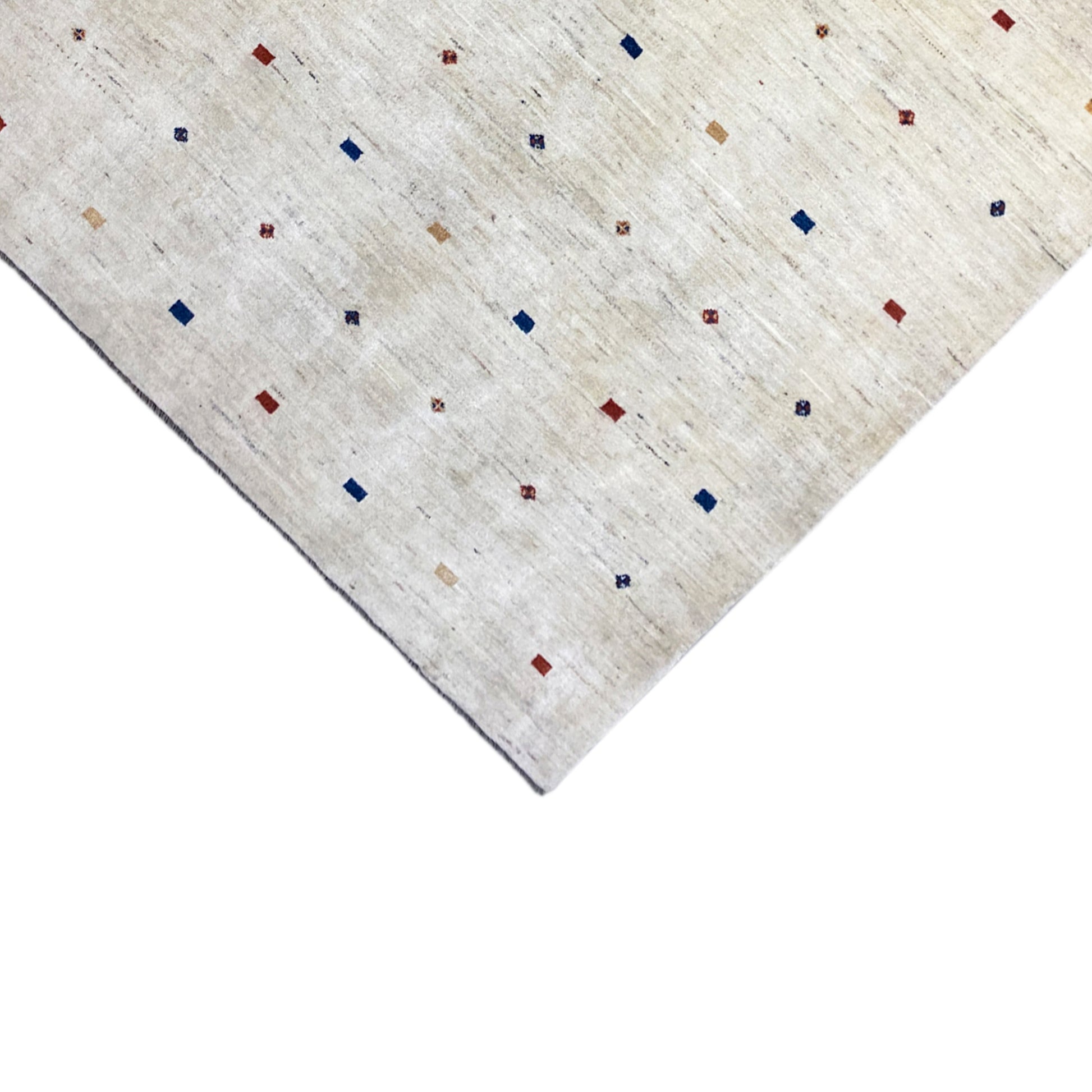 Dieser elegante, handgeknüpfte Gabbeh Teppich aus handgesponnener, pflanzengefärbter Wolle besticht durch seinen ruhigen beigefarbenen Hintergrund, der subtil mit kleinen, farbigen Akzenten in geometrischen Formen durchsetzt ist. Mit seinen großzügigen Maßen von 286x196 cm ist er eine ideale Ergänzung für moderne oder minimalistische Wohnräume und schafft eine helle, beruhigende Atmosphäre. Das schlichte, aber ansprechende Muster und die natürliche Haptik der Wolle machen diesen Teppich zu einem zeitlosen Stück, das Eleganz und Komfort auf unaufdringliche Weise verbindet.