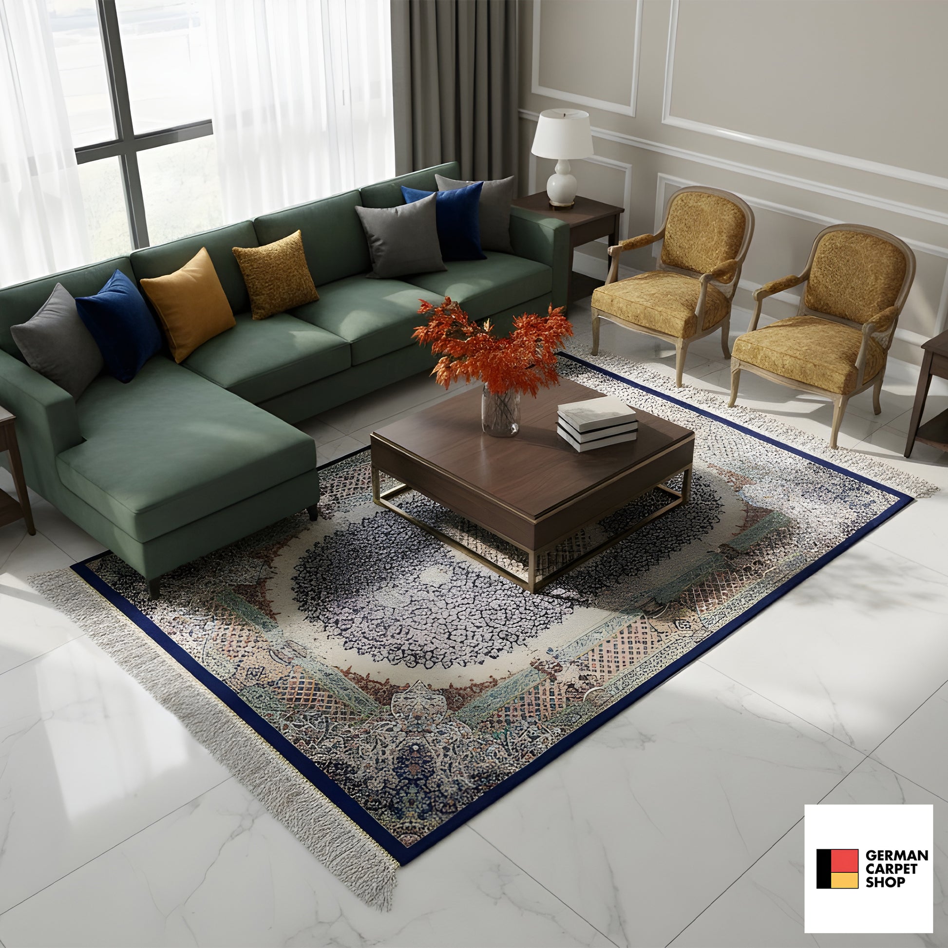 Hinweis: Transportbedingte Falten, wie Sie teilweise auf den Abbildungen zu sehen sind, legen sich innerhalb von wenigen Tagen nach Auslage des Teppichs.