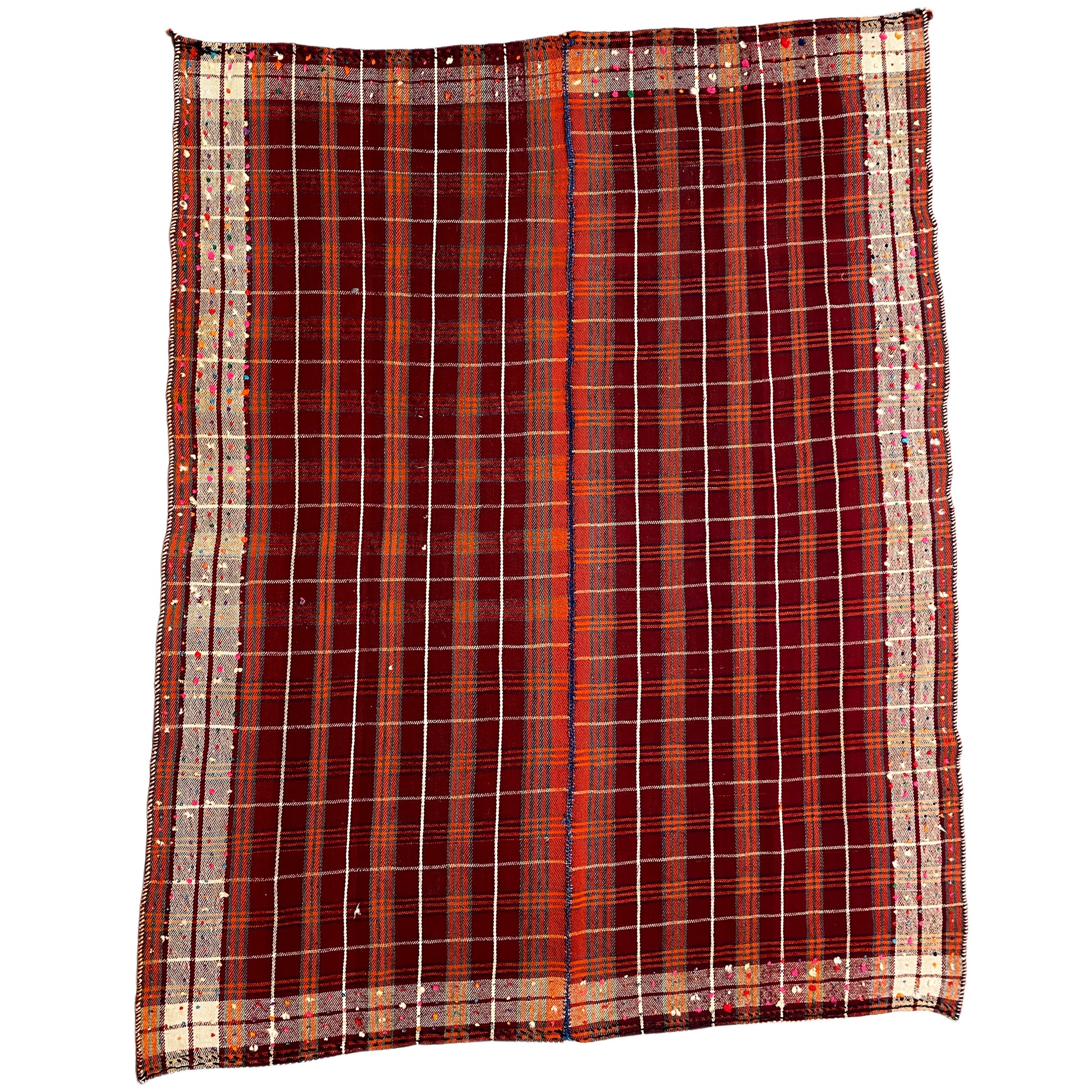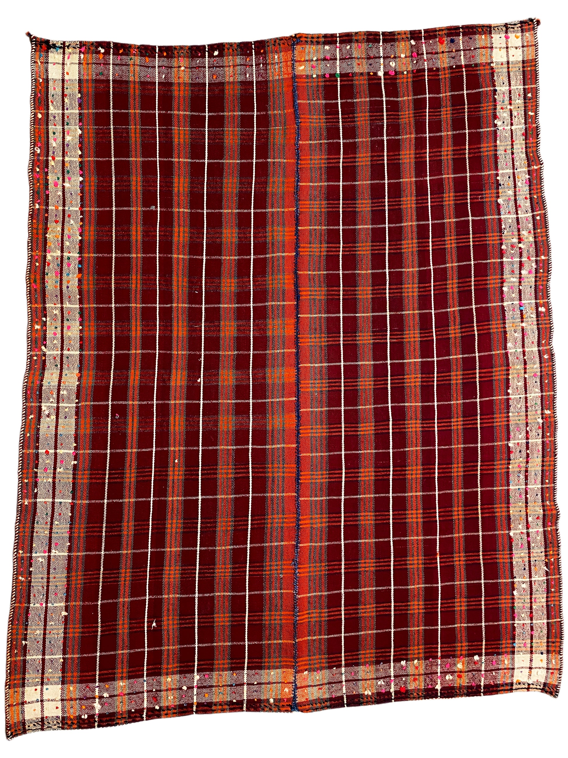 Das Design zeigt ein tief weinrotes Karomuster, veredelt mit feinen Linien in Orange und Weiß – ein harmonisches Farbspiel, das sich sowohl in klassische als auch in zeitgenössische Interieurs hervorragend einfügt.
