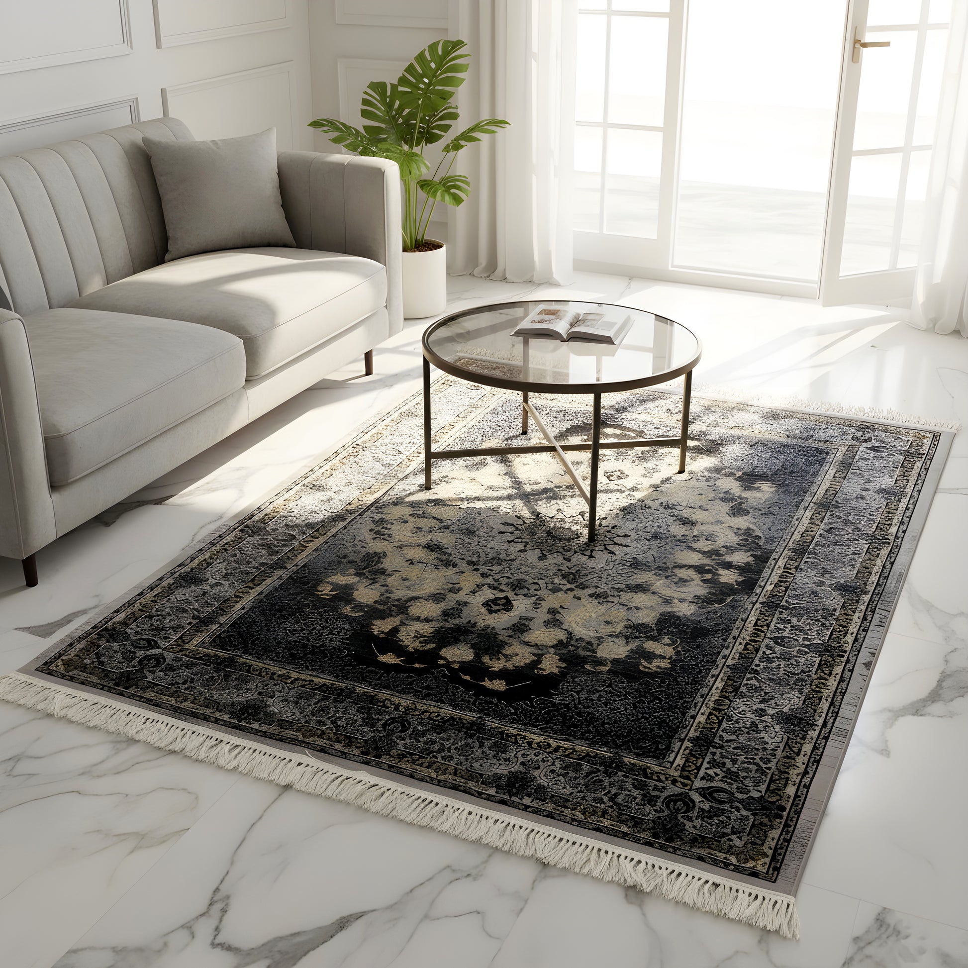 Dieser beeindruckende, maschinell gewebte Teppich in der Größe 160x230 cm ist ein stilvoller Blickfang für moderne und klassische Wohnräume. Das strapazierfähige Polypropylen-Flormaterial gewährleistet Langlebigkeit und einfache Reinigung, perfekt für stark frequentierte Bereiche. Der Teppich zeigt ein kunstvolles, orientalisch inspiriertes Muster in eleganten Dunkelgrau- und Anthrazit-Tönen, akzentuiert durch ein zentrales Medaillon in Gold und Beige. Dieses anspruchsvolle Klassik-Design mit Glamour-Faktor schafft eine markante und gleichzeitig luxuriöse Atmosphäre. Verleihen Sie Ihrem Wohnzimmer oder Esszimmer mit diesem Teppich eine tiefgründige Eleganz.