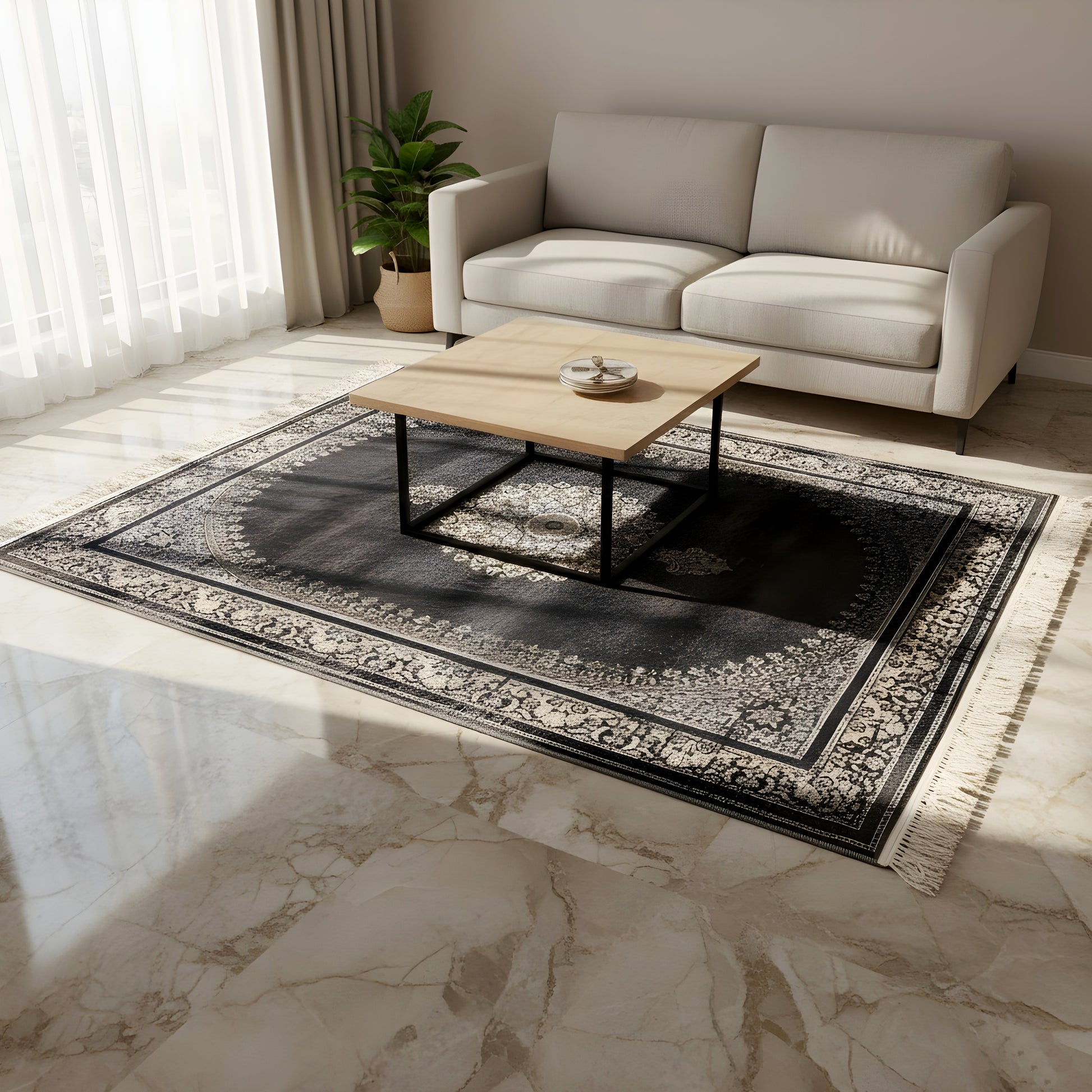 Maschinell gewebter Teppich aus Polypropylen im klassischen Orient-Dekor mit zentriertem Medaillon, dunklem ovalem Feld und floraler Bordüre in Schwarz, Grau, Beige und Weiß. Die Größe 160x230 cm bietet weiche Haptik, hohe Strapazierfähigkeit und einfache Pflege für Wohnzimmer, Esszimmer und Schlafzimmer. Das zeitlose Muster setzt elegante Akzente und ergänzt traditionelle wie moderne Einrichtungen, ideal für stilvolle Wohnräume mit langlebigem Komfort.