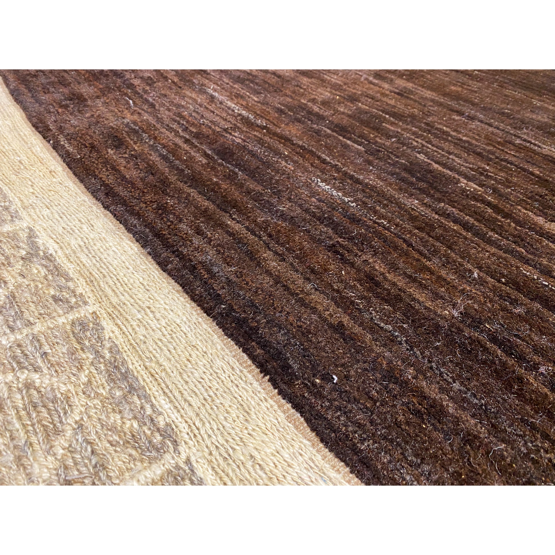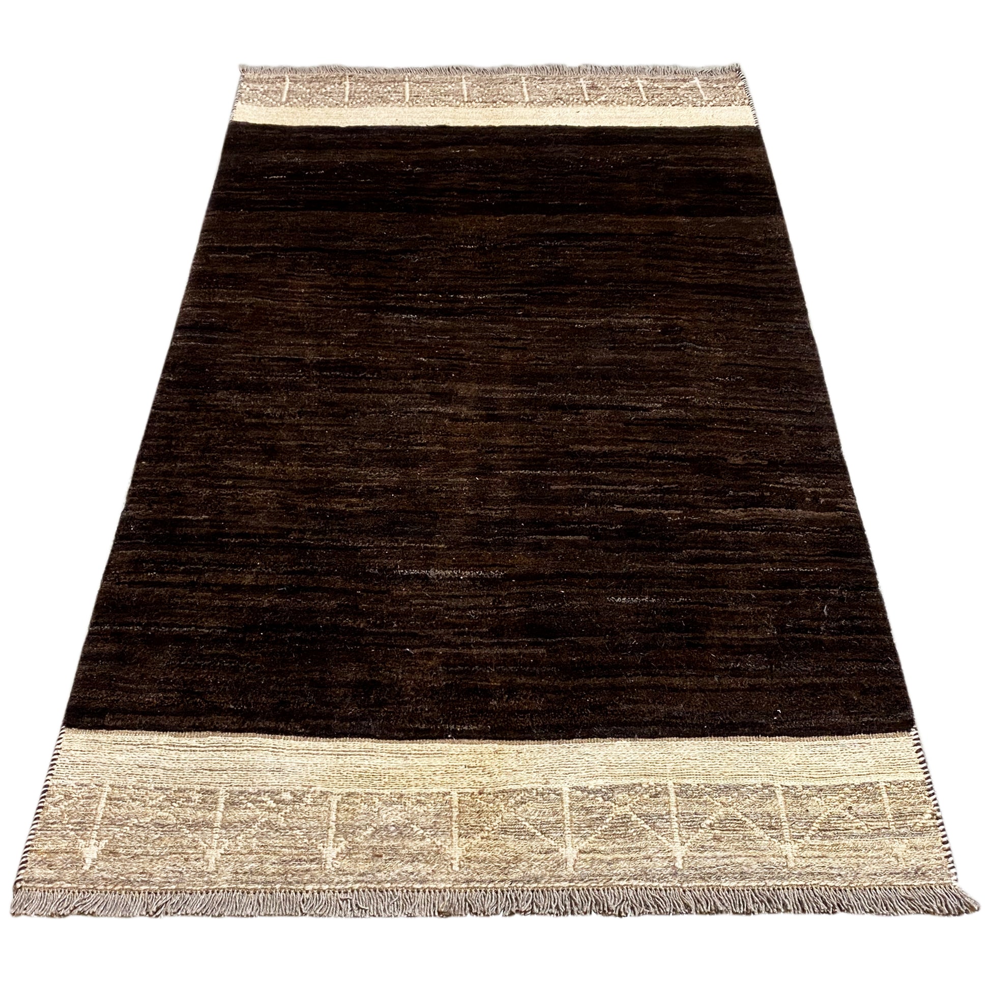 Aus handversponnener, pflanzengefärbter Wolle gefertigt, überzeugt der Teppich mit seinem ruhigen, blockartigen Muster in tiefem Braun und dezenten hellen Akzenten. Mit seinen Maßen von 184x113 cm eignet er sich ideal für kleinere Räume, Flure oder als stilvoller Akzent in modernen Wohnbereichen.