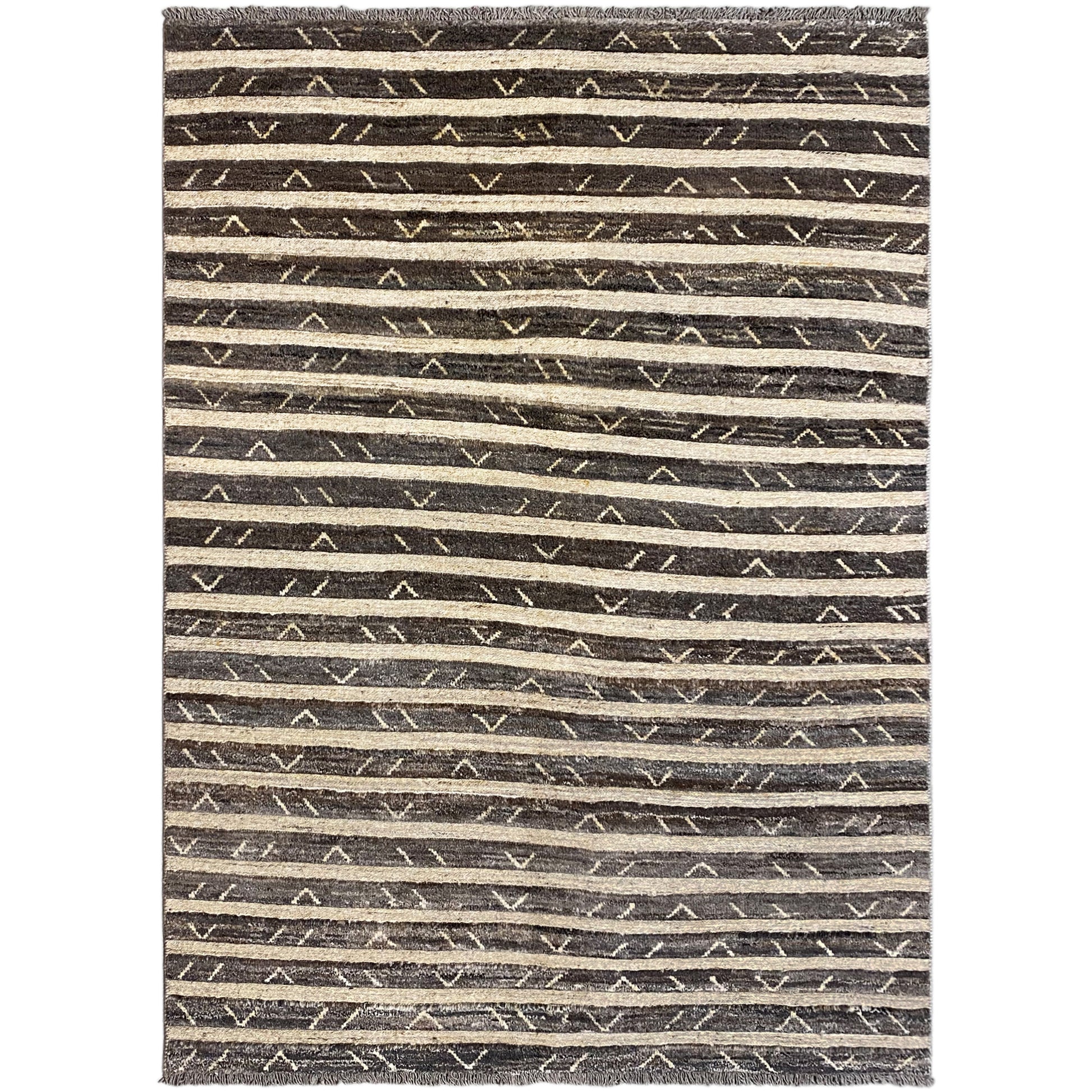Aus handgesponnener, pflanzengefärbter Wolle hergestellt, begeistert der Teppich mit seinem feinen Streifenmuster in sanften Grau- und Beigetönen, ergänzt durch dezente geometrische Akzente. Die großzügigen Maße von 195x150 cm machen ihn ideal für Wohnräume, Schlafzimmer oder als stilvoller Blickfang im Boho-Interieur.