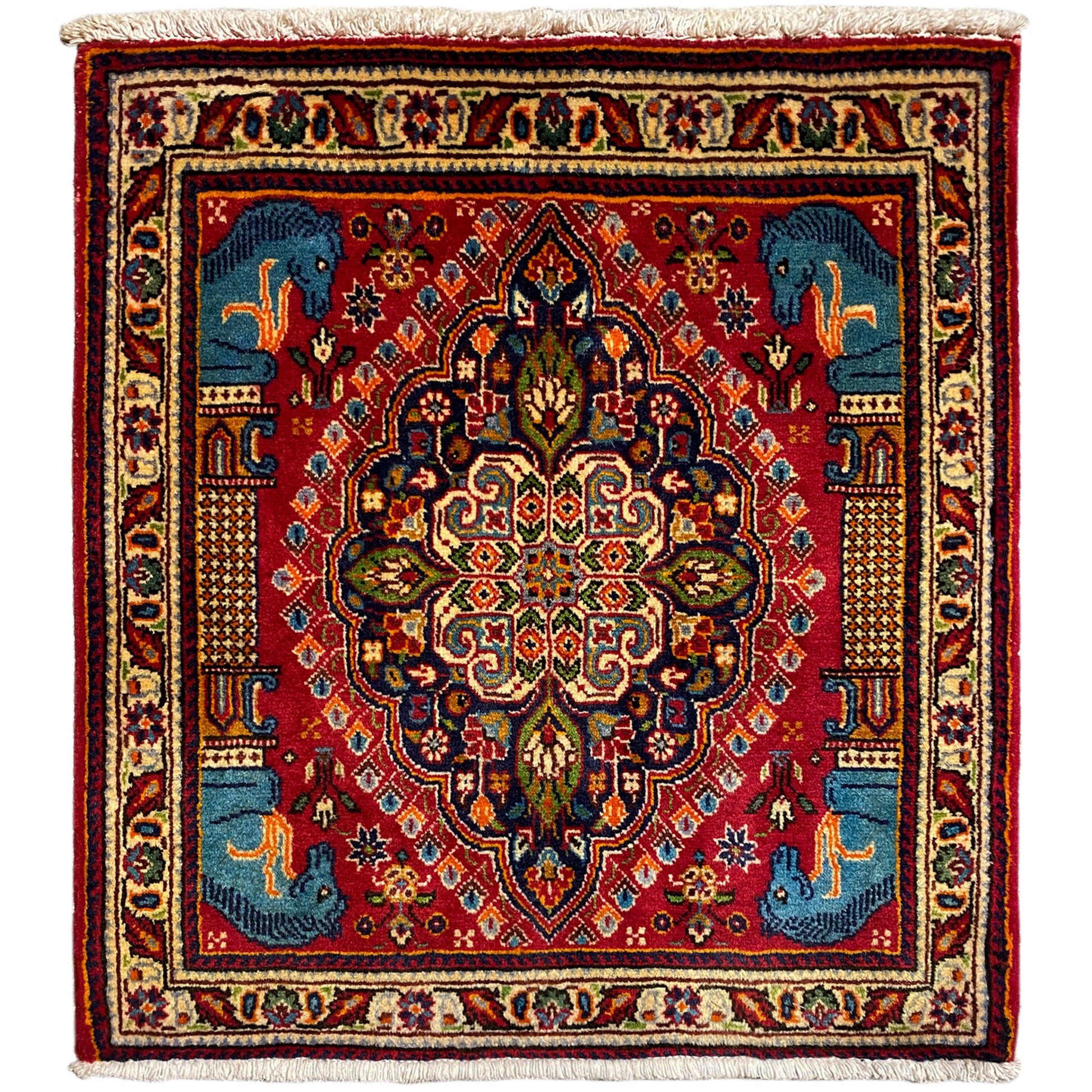 Dieser exquisite, handgeknüpfte Poshti Teppich in leuchtendem Rot ist ein authentisches Beispiel der Handwerkskunst südlicher iranischer Nomadenvölker. Insbesondere die von der "Tork"-Stammesgruppe gewebten Teppiche werden liebevoll als "Torkey" bezeichnet. Mit seinen Maßen von 69x58 cm ist dieses Stück ideal, um jedem Raum einen Hauch von traditionellem Dekor und Gemütlichkeit zu verleihen, akzentuiert durch ein detailreiches Medaillonmuster mit floralen Motiven. Die robuste Handwerkskunst aus Wolle und Baumwolle sowie die lebendigen Farben machen ihn zu einem langlebigen und stilvollen Akzent.