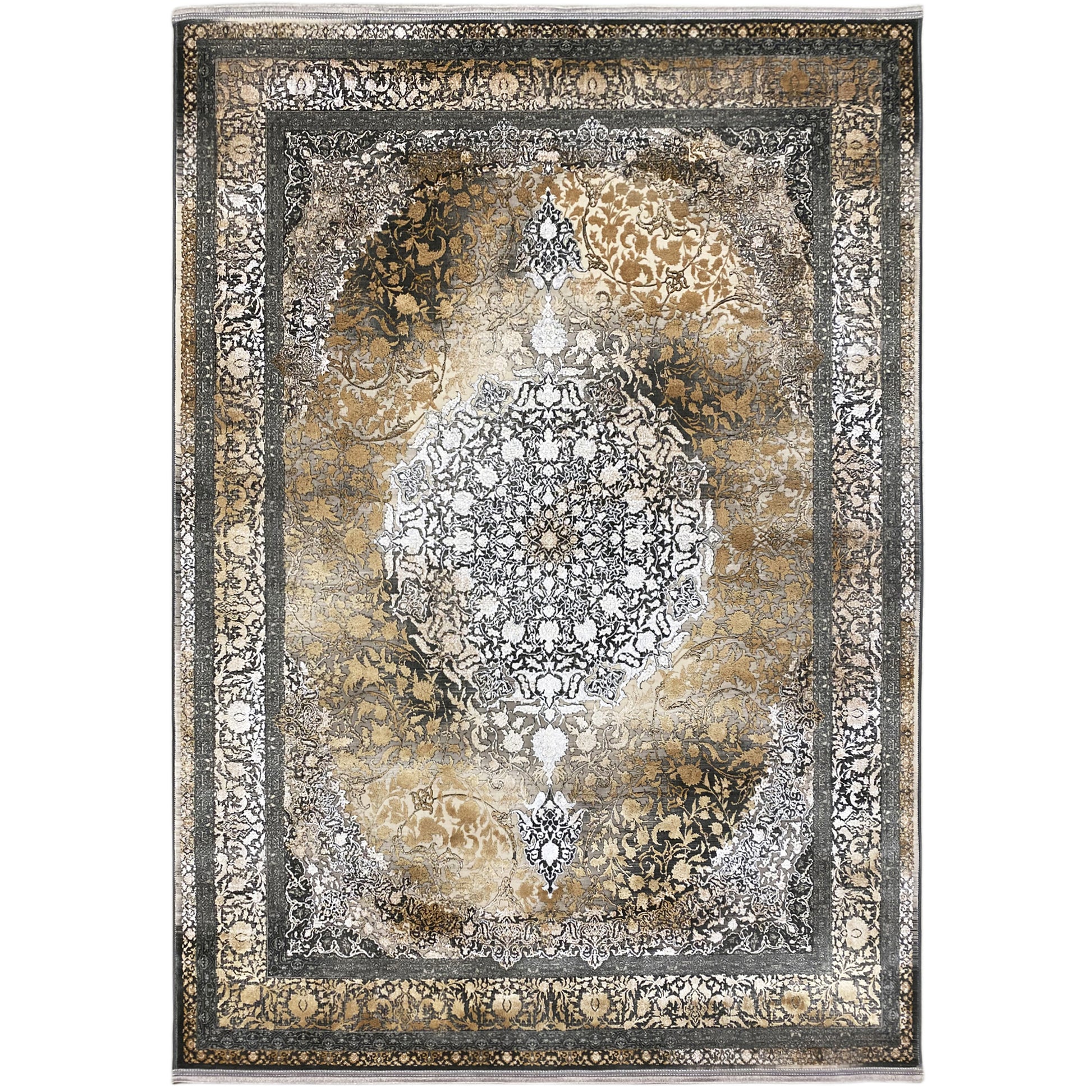 Verleihen Sie Ihrem Zuhause einen Hauch von Vintage-Eleganz mit diesem wunderschönen modernen Klassiker-Teppich. Sein kunstvolles zentrales Medaillon hebt sich von einem atemberaubenden rauchgoldenbraunen Hintergrund mit einem dezenten Farbverlauf und einem Used-Look ab. Gefertigt aus 100% hitzebehandeltem Acryl, ist dieser weiche und strapazierfähige Teppich perfekt für stark frequentierte Bereiche und verbindet luxuriösen Stil mit moderner Widerstandsfähigkeit. Die großzügige Größe von 170x240cm ist ideal, um Ihrem Wohn- oder Schlafzimmer einen raffinierten Blickfang zu verleihen.
