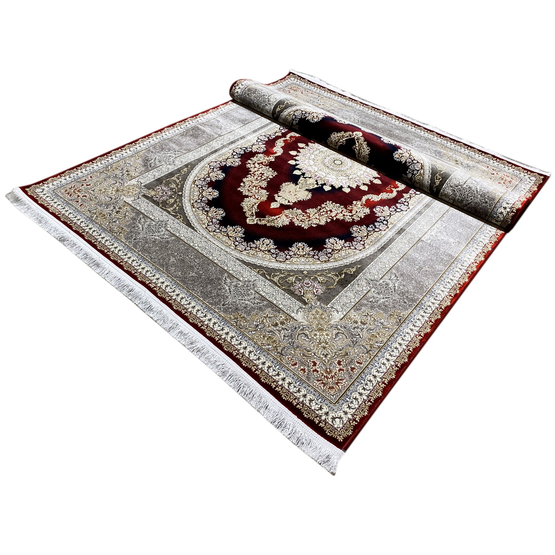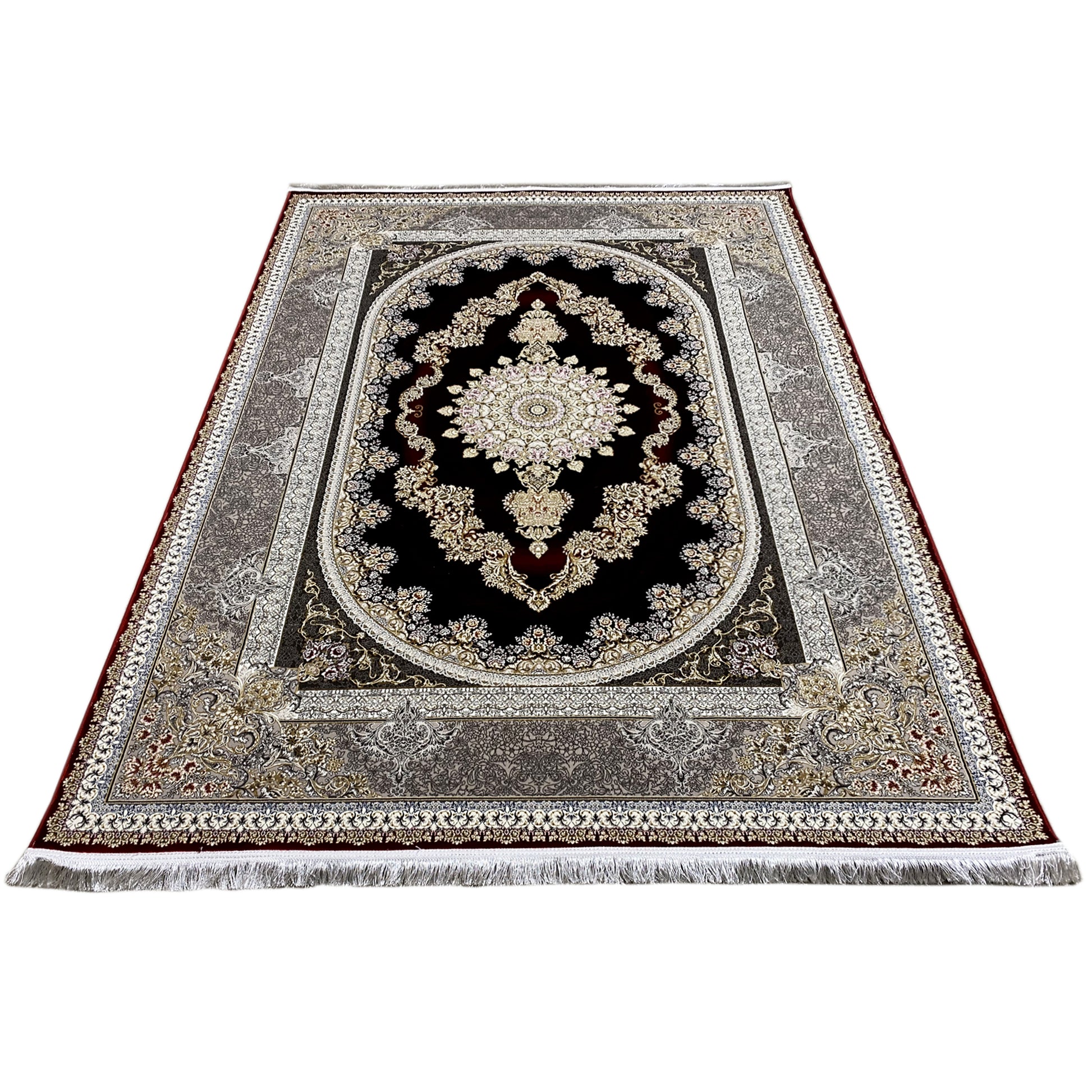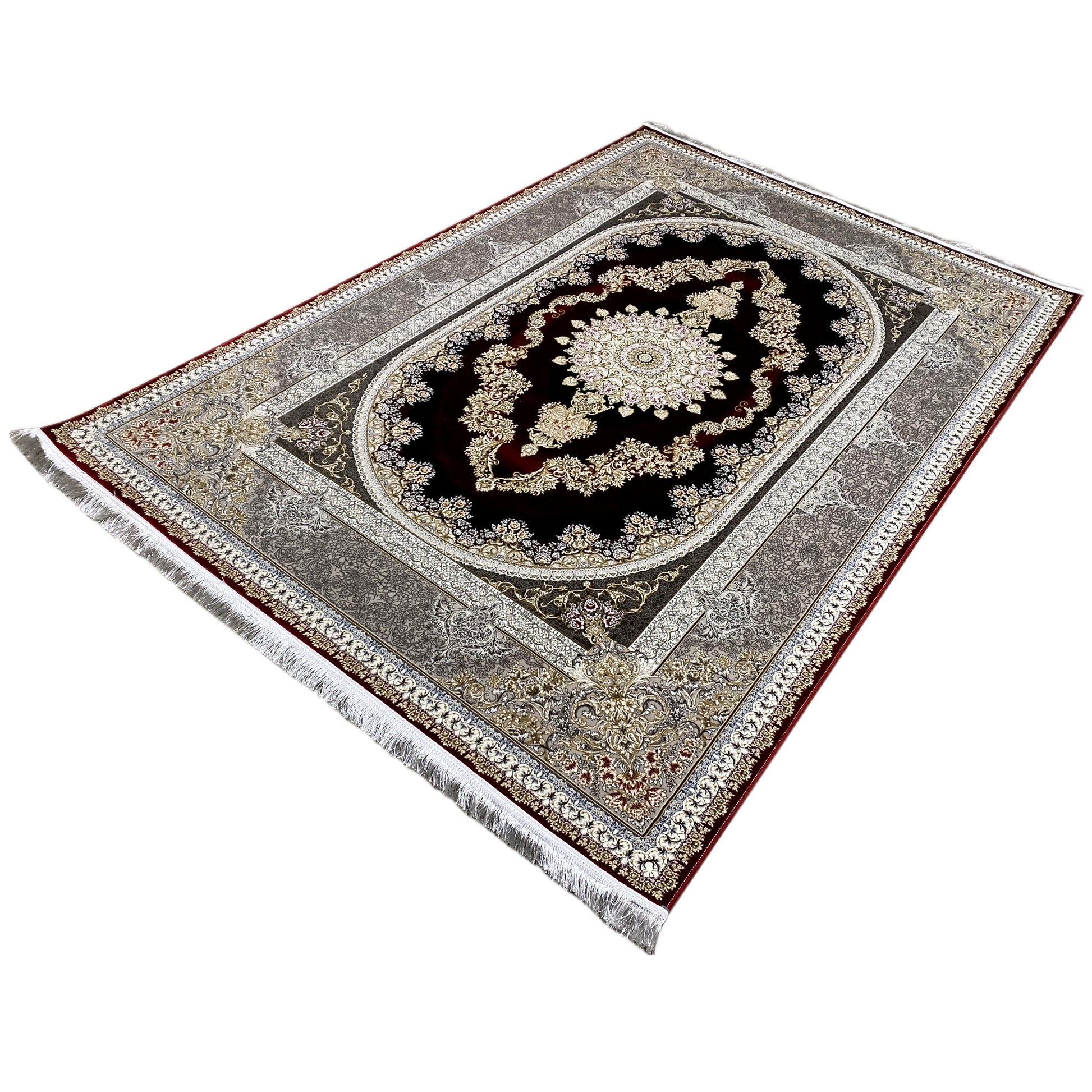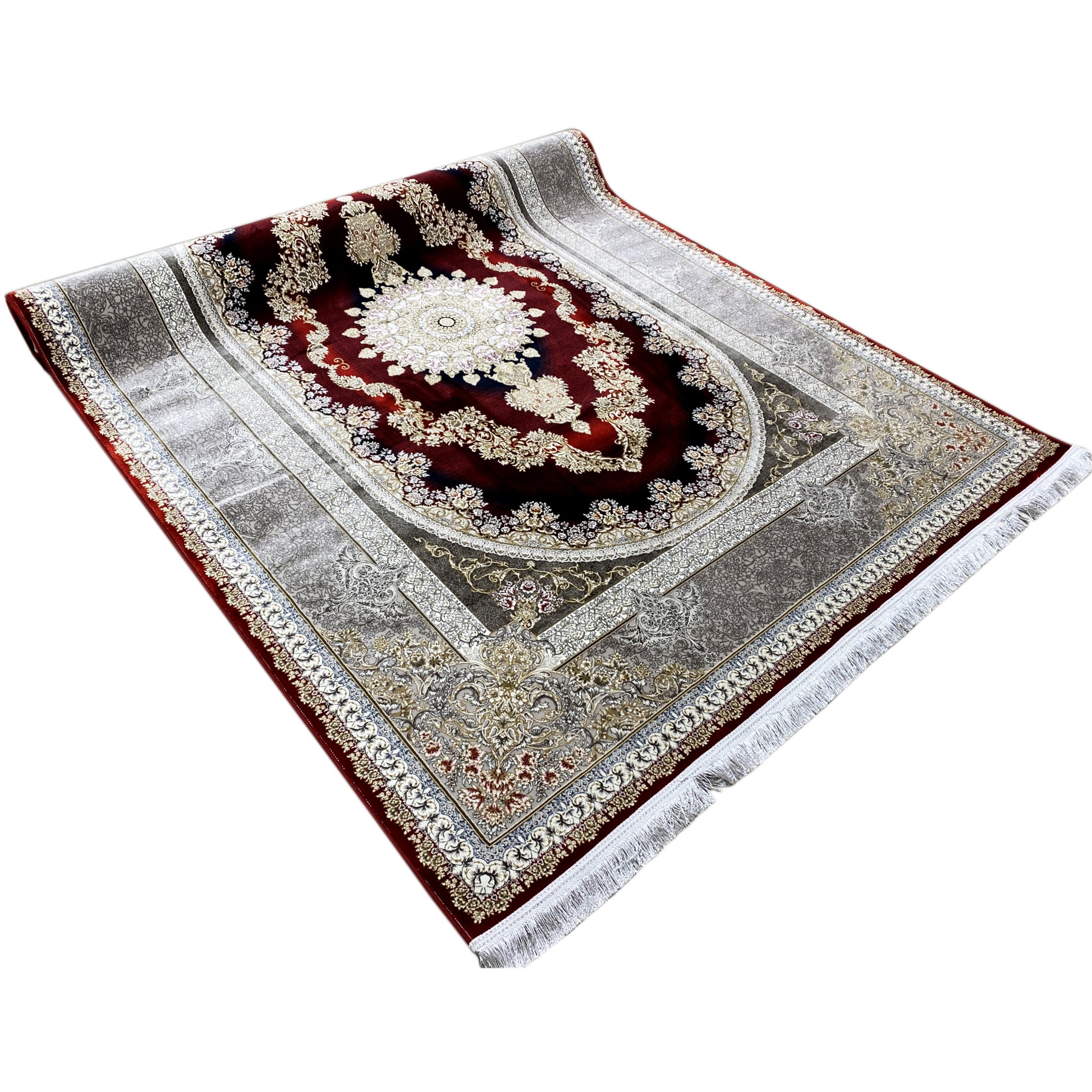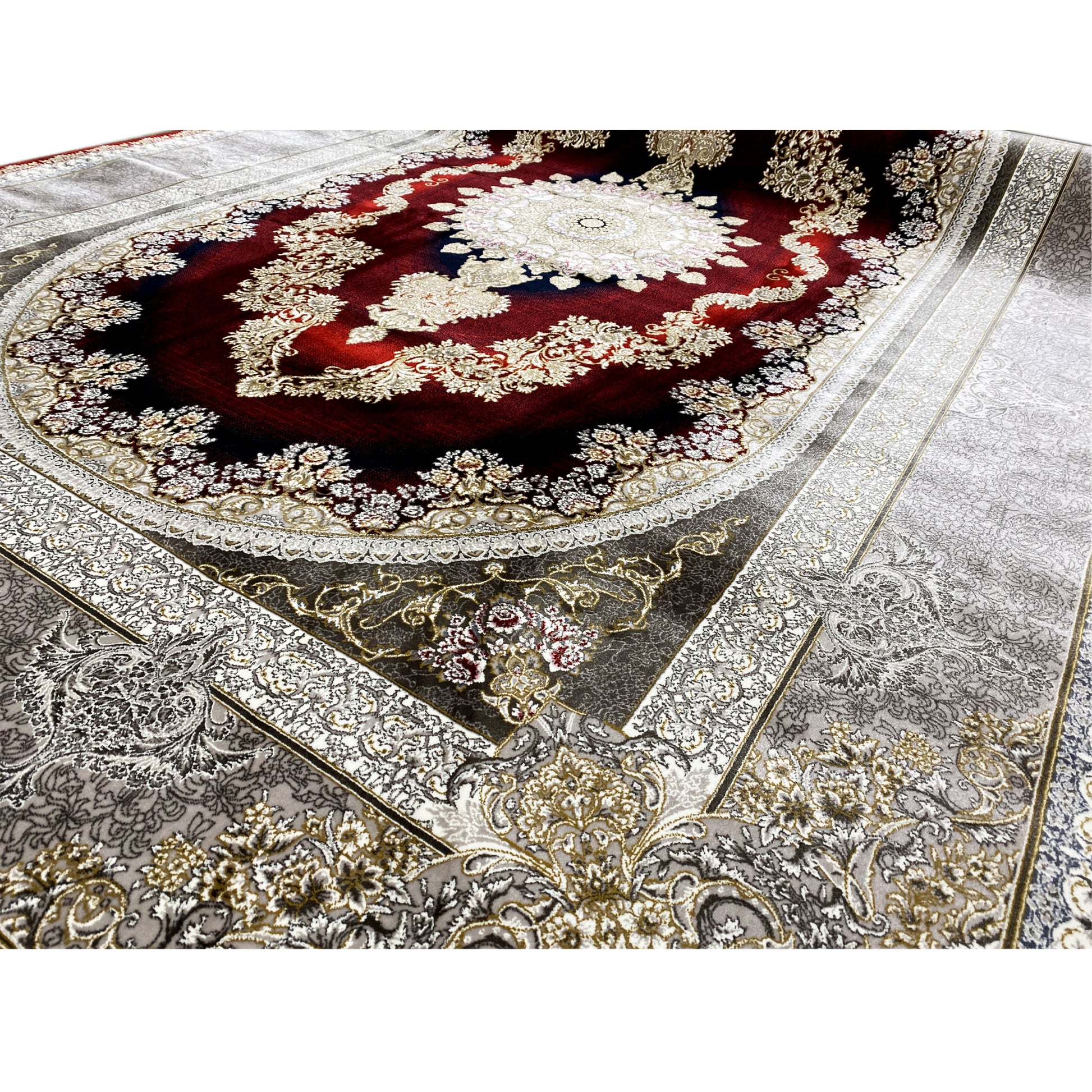 Verleihen Sie Ihrem Zuhause opulente Eleganz mit diesem wunderschönen klassischen Teppich. Sein markantes ovales Medaillon-Design zeigt eine kunstvolle Musterung in tiefen Rot- und Goldtönen, die von einer raffinierten silbernen Bordüre umrahmt wird. Gefertigt aus 100% hitzebehandeltem Acryl, ist dieser weiche und strapazierfähige Teppich ideal für stark frequentierte Bereiche und verbindet luxuriösen Stil mit moderner Widerstandsfähigkeit. Die großzügige Größe von 170x240cm macht ihn zum perfekten Statement-Stück für Ihr Wohn- oder Esszimmer.