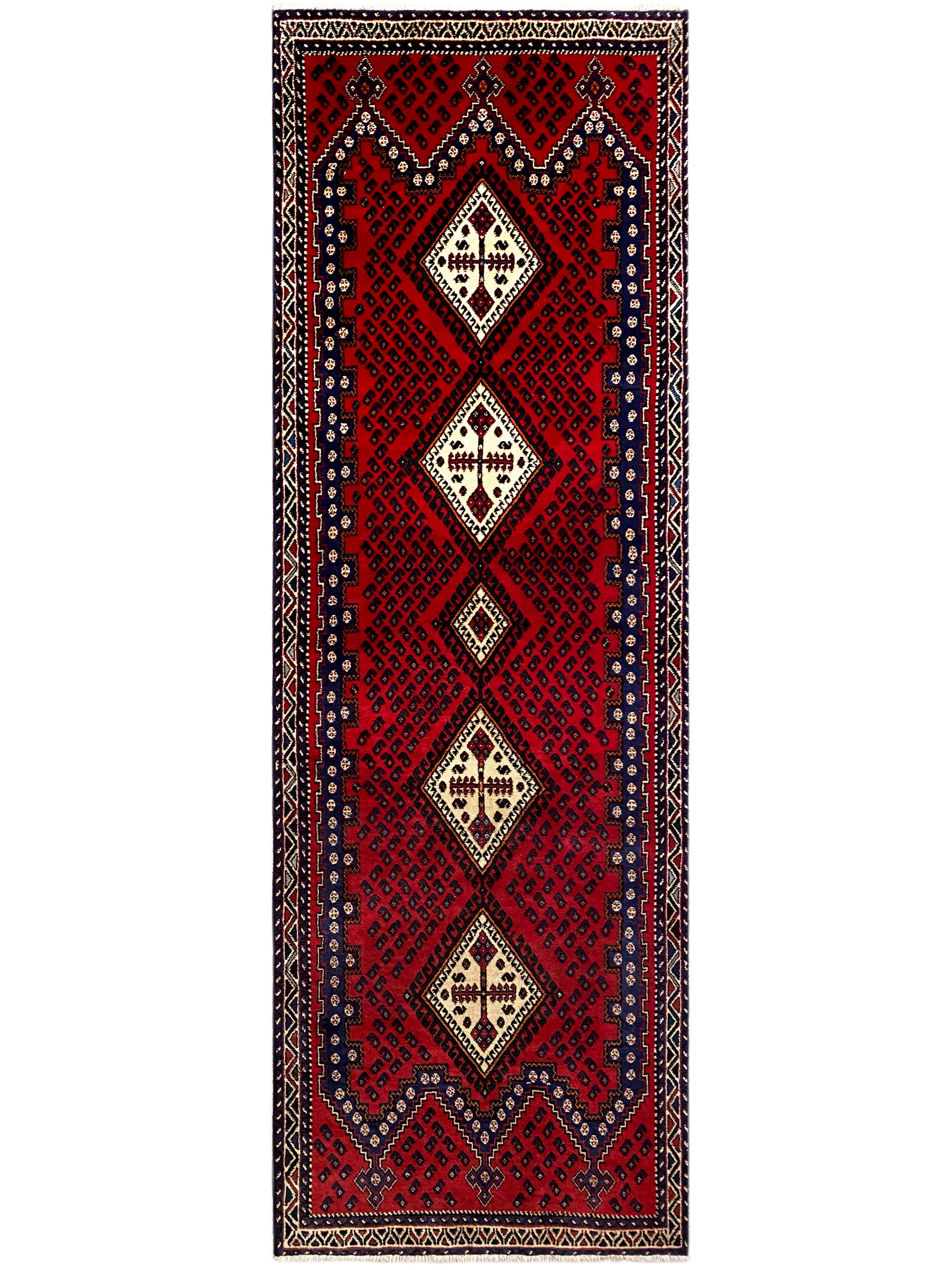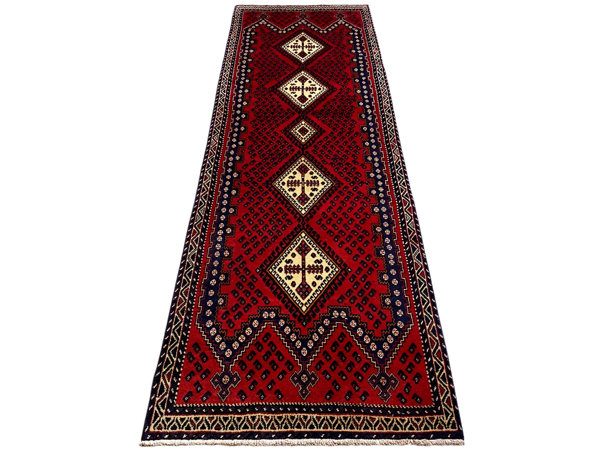 Dieser handgeknüpfte Sirjan Läufer Teppich präsentiert ein traditionelles, geometrisches Design in einem tiefen Rotton, akzentuiert durch cremefarbene, blaue und schwarze Details. Das Muster besteht aus einer Reihe von stilisierten Rauten, die entlang der Längsachse angeordnet sind und von einer detailreichen Bordüre mit floralen und geometrischen Elementen eingerahmt werden. Gefertigt aus hochwertiger, handversponnener Wolle und mit Pflanzenfarben gefärbt, besticht dieser Teppich nicht nur durch seine lebendigen Farben und sein ansprechendes Design, sondern auch durch seine natürliche Textur und Langlebigkeit. Mit seinen Maßen von 282x89 cm eignet er sich ideal, um Flure, Eingangsbereiche oder andere schmale Räume stilvoll aufzuwerten und einen Hauch von orientalischer Eleganz zu verleihen. Das klassische Muster integriert sich wunderbar in traditionelle, rustikale oder auch eklektische Dekorstile und schafft eine warme und einladende Atmosphäre. Dieser Teppich ist nicht nur ein hochwertiger Bodenbelag, sondern auch ein Zeugnis traditioneller persischer Knüpfkunst und natürlicher Schönheit.
