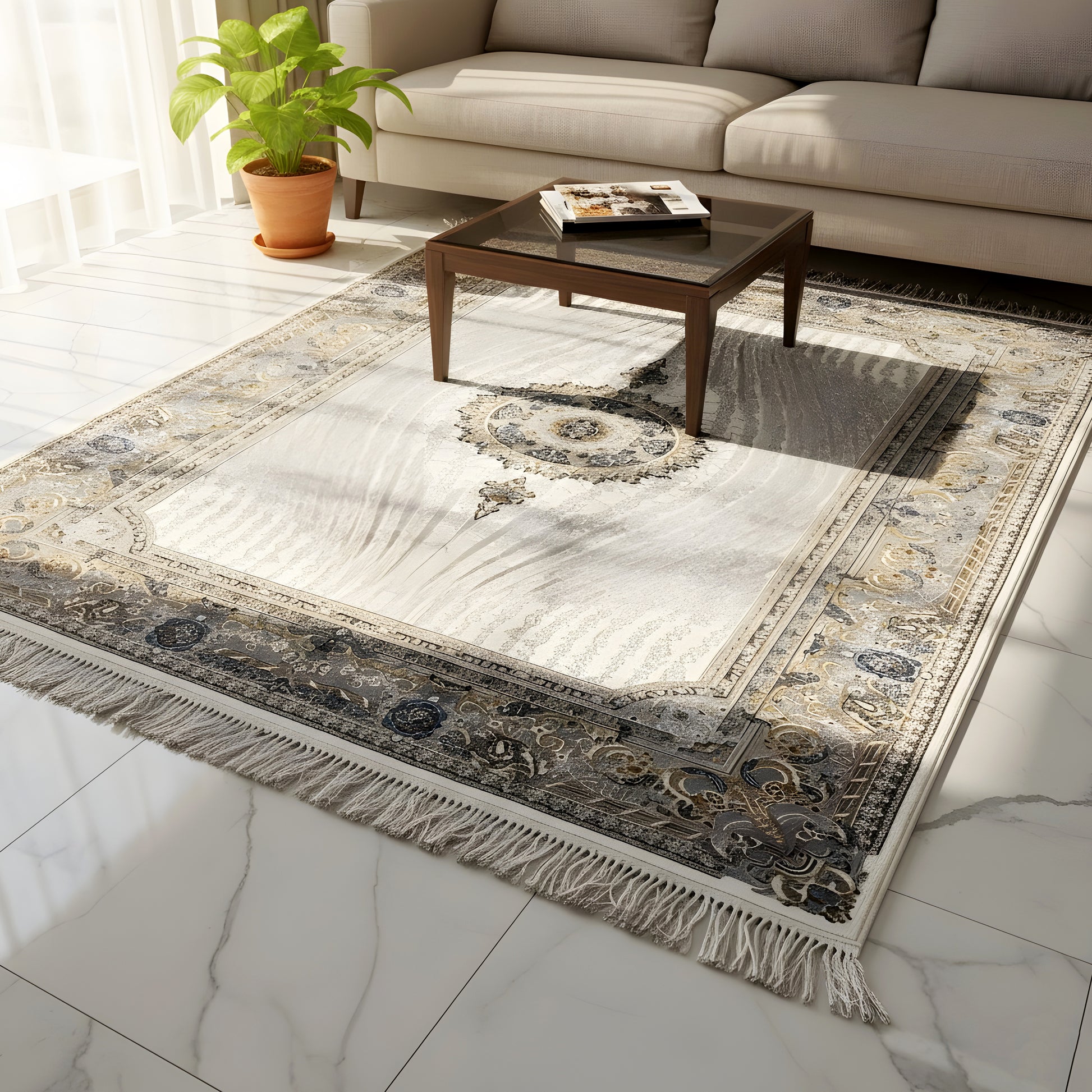 Dieser maschinengewebte Polypropylen-Teppich im klassischen Vintage-Stil mit einer Größe von 160x230 cm besticht durch sein elegantes Medaillon-Muster in sanften Grau- und Beigetönen. Das strapazierfähige Material ist besonders pflegeleicht und robust, ideal für stark frequentierte Bereiche wie das Wohn- oder Schlafzimmer. Verleihen Sie Ihrem Zuhause einen Hauch von zeitloser Eleganz und schaffen Sie mit diesem stilvollen Bodenschmuck eine gemütliche Atmosphäre – perfekt für modernes und klassisches Dekor.